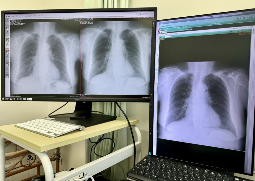 レントゲン検査は、X線を利用して体内の画像を撮影する診断方法です。肺炎・心不全の診断や腹部症状の原因検索のために行います。