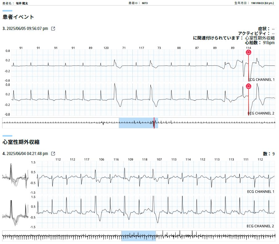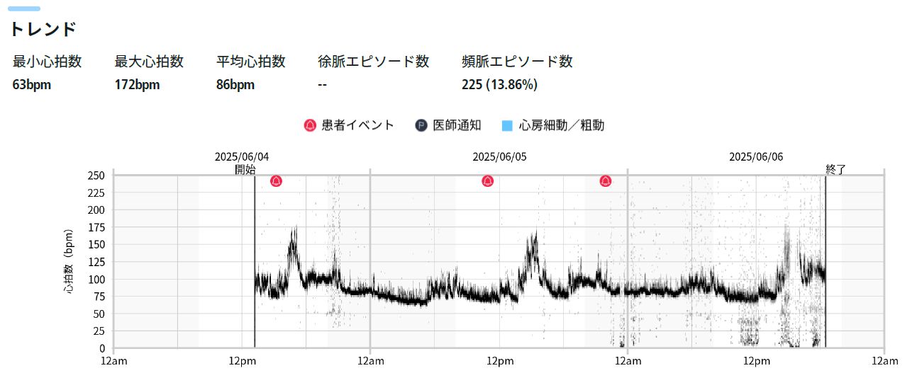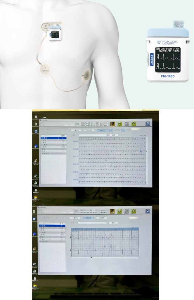 自宅あるいは勤務中等の日常生活中の心電図測定には上記の携帯心電計や24時間ホルター心電計を使用しています。それに加えて2025年6月より5-10日間の長期に渡り連続記録可能な心電計が使用可能となりました。