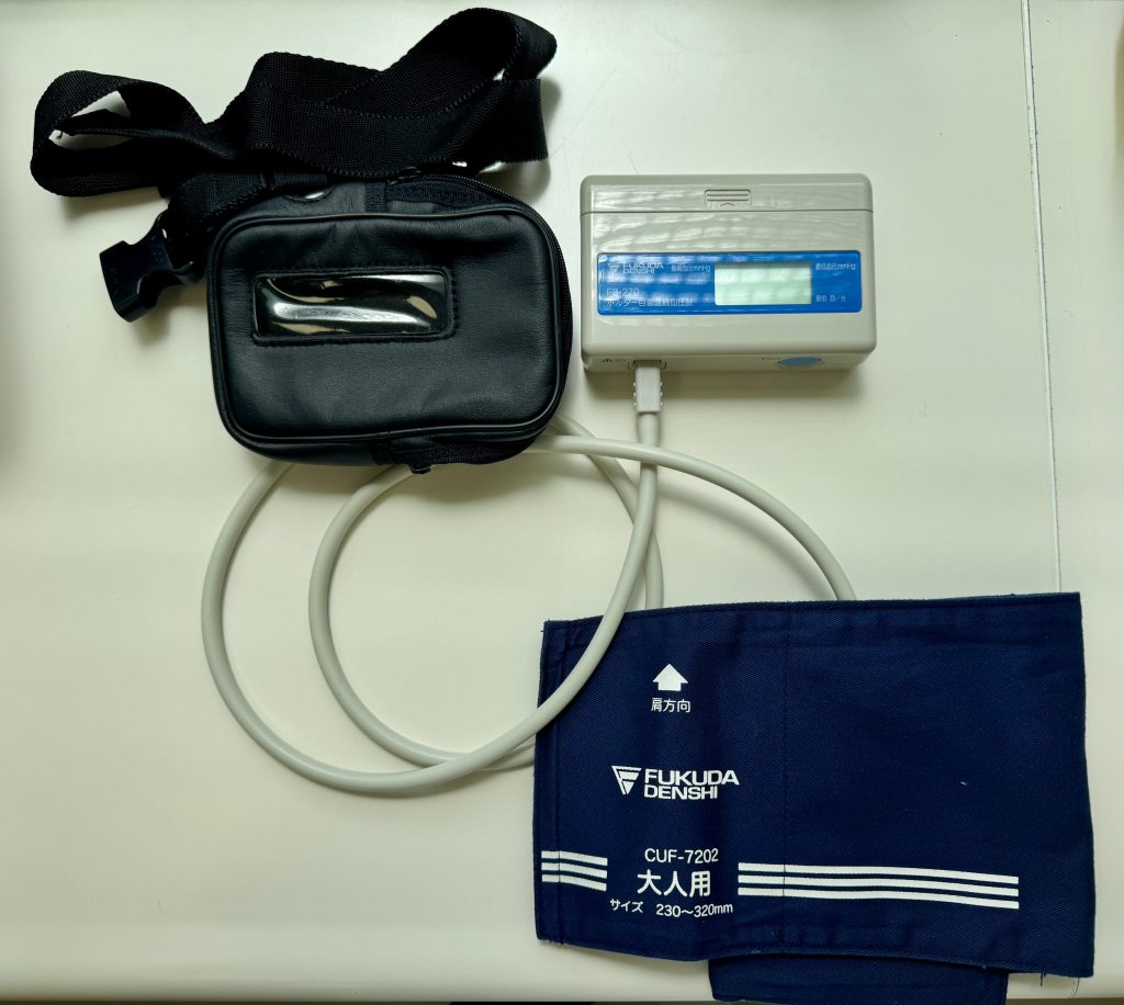 ホルター血圧計は腕に巻かれるカフと、患者のベルトやポケットに装着する小型の記録装置で構成されています。このカフは設定された間隔(通常は15分から30分おき)で自動的に膨らみ、血圧を測定し、データを記録装置に保存します。