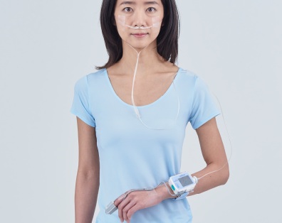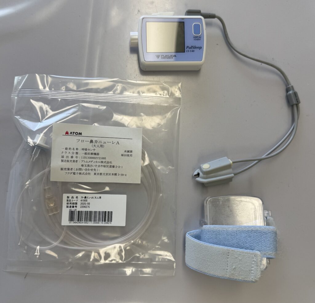 就寝中に指に挟む装置(酸素飽和度チェック)と鼻にかける管(呼吸チェック)を装着するだけの簡便な検査です。
